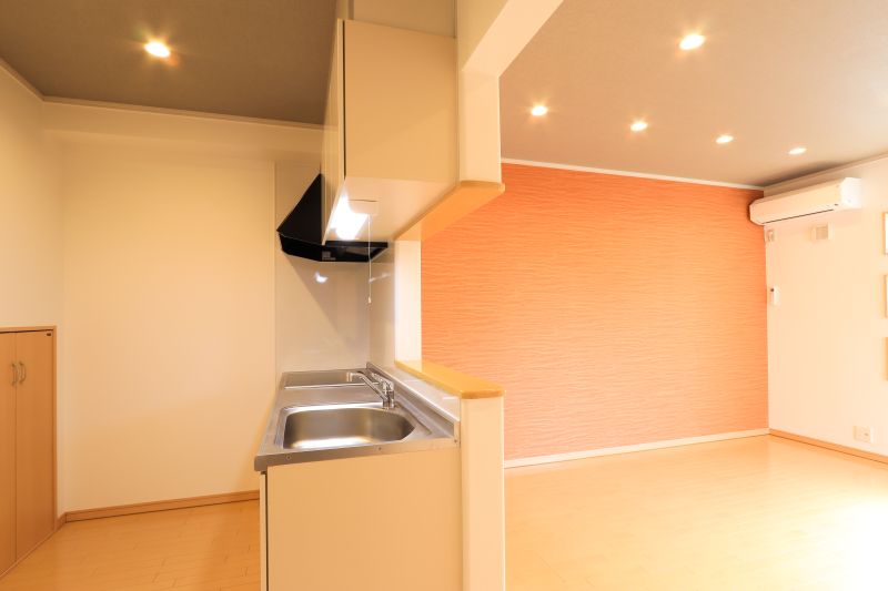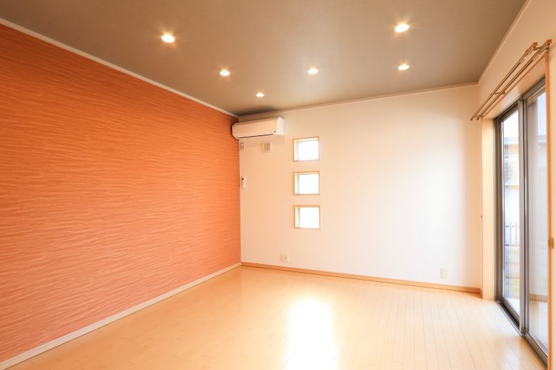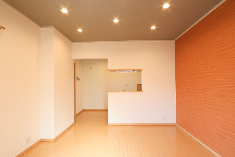 明るいオレンジの壁紙が、毎日をパッと前向きに彩る2LDK。